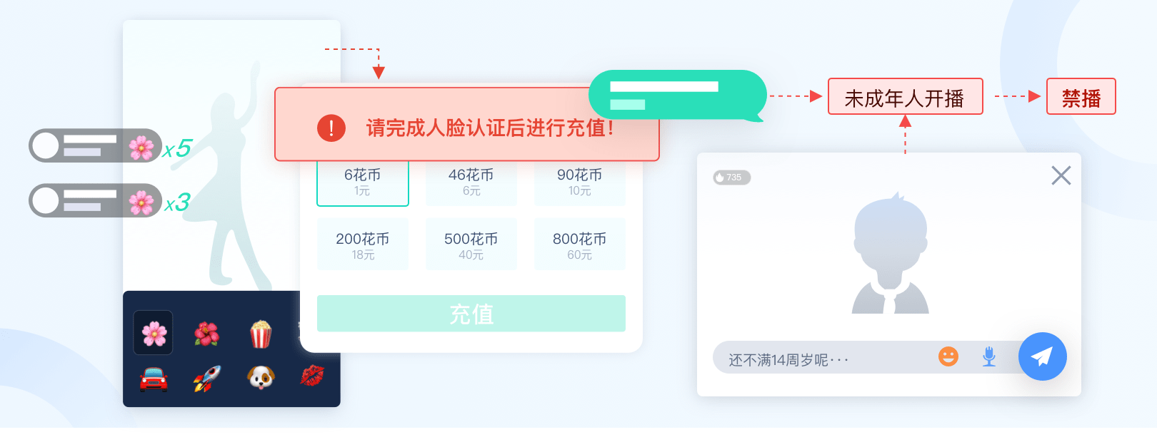 识别未成年用户,禁用其使用17+产品,限制其直播、打赏等相关功能,避免因未成年人监管问题导致平台下架或处罚